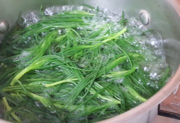 4Caliamoli in acqua salata a bollore.5Facciamoli cuocere per un paio di minuti.6Scoliamoli e facciamoli sgocciolare in un colino; intanto facciamo soffriggere 2 spicchi d'aglio ed un peperoncino tritato in 2 cucchiai d'olio evo.