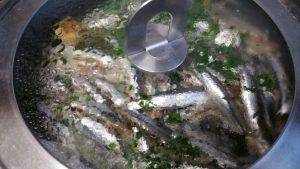 Le alici vengono servite con il loro fondo di cottura: un brodetto delizioso che si accompagna alla perfezione con i crostini che abbiamo preparato con del pane avanzato insaporito con un'emulsione fatta di olio sale e pepe. Le alici vengono fatte prima rosolare (per insaporire e mantenere sode le carni) e successivamente si aggiunge l'acqua per formare un sugo bianco gustosissimo, profumato e dalla semplicità disarmante. Tra le Ricette con Alici Fresche In Padella questa è sicuramente una delle più golose.COTTURA ALICI IN PADELLA