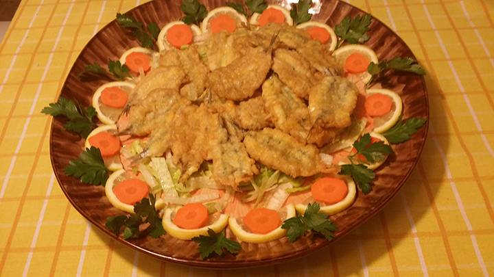 45Mettete la vostre alici indorate e fritte su della carta da cucina assorbente6Disponetele su un bel letto d'insalata perfettamente asciutta (da condire, poi, in ogni singolo piatto) e portatele in tavola. Buon appetito!