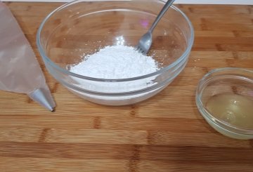 10Ora siamo pronti per la cottura: forno statico preriscaldato a 180 gradi per 12 minuti.11Intanto prepariamo la ghiaccia reale: versiamo in una ciotola 100 g. di zucchero a velo e versiamo in una seconda ciotolina 1 albume d'uovo.12Versiamo l'albume un po' alla volta sullo zucchero a velo, aiutandoci con un cucchiaino; lavoriamo la ghiaccia con una forchetta, fino ad ottenere un composto cremoso e molto denso (l'albume non va utilizzato tutto) a cui aggiungeremo, mescolando 1 goccia di limone.