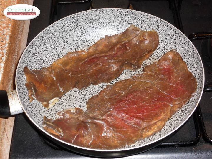 4Fatele friggere finchè si saranno ben dorate girandole un paio di volte in modo che si insaporiscano bene5Quindi prelevatele con una schiumarola forata e sgocciolatele bene6Mettete le fette di carne salada in una padella antiaderente