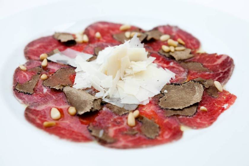 Tagliate a fettine molto sottili il filetto di manzo con un coltello affilatissimo oppure fatelo tagliare dal macellaio. Distribuitele sui piatti individuali stendendole molto bene. Preparate una salsa mettendo il succo di limone e l'olio extravergine di oliva in una ciotola insieme al sale e al pepe appena macinato e facendo ben emulsionare gli ingredienti.