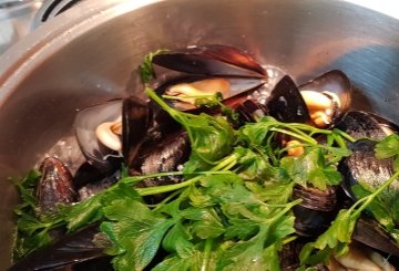 10Le vostre Cozze alla Busara sono pronte. Gustatele calde con prezzemolo fresco tritato al momento. Buon Appetito!