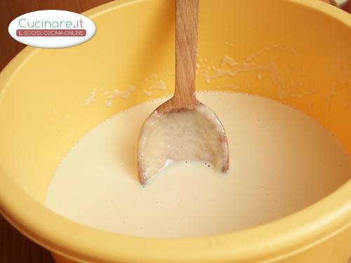 1Unite in una ciotola la farina setacciata con il latte e un pizzico di sale2Mescolate in modo da ottenere un composto liscio e senza grumi. Sbattete le uova in una ciotola e unitele alla pastella, infine, fate fondere il burro in un pentolino e quando sarà completamente fuso, incorporatele alla pastellaCoprite la ciotola con uno strato di pellicola trasparente e lasciate in posa per circa 1 ora in un luogo fresco (non in frigorifero).