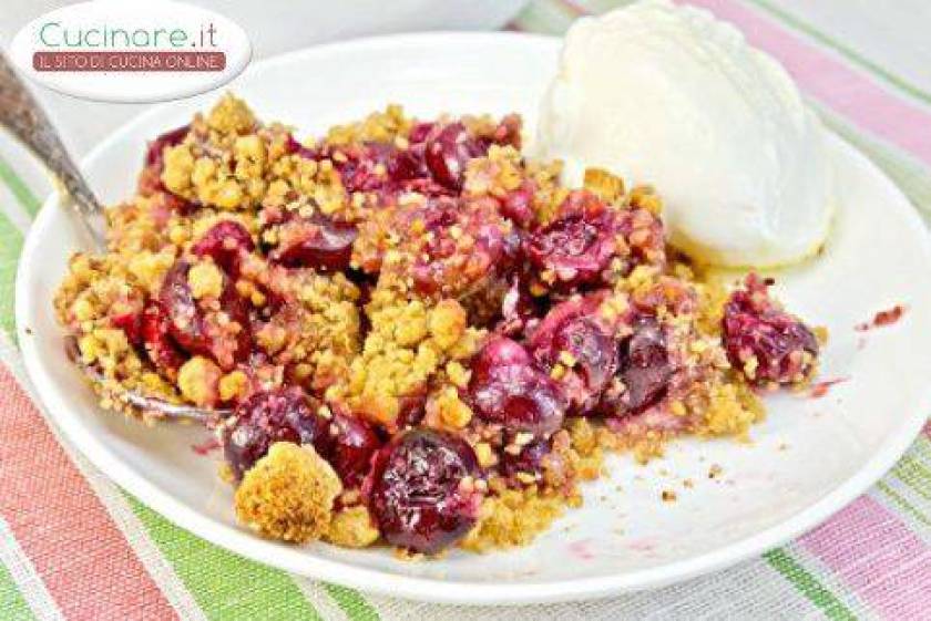Imburrate una pirofila dai bordi abbastanza alti, ungetela col burro e cospargetela con lo zucchero di canna. Mettete le ciliegie nella pirofila e livellatele, cospargete con il composto di briciole fino a coprire totalmente la frutta. Infornate per 30 minuti o fino a che la crosta non sarà dorata e croccante.