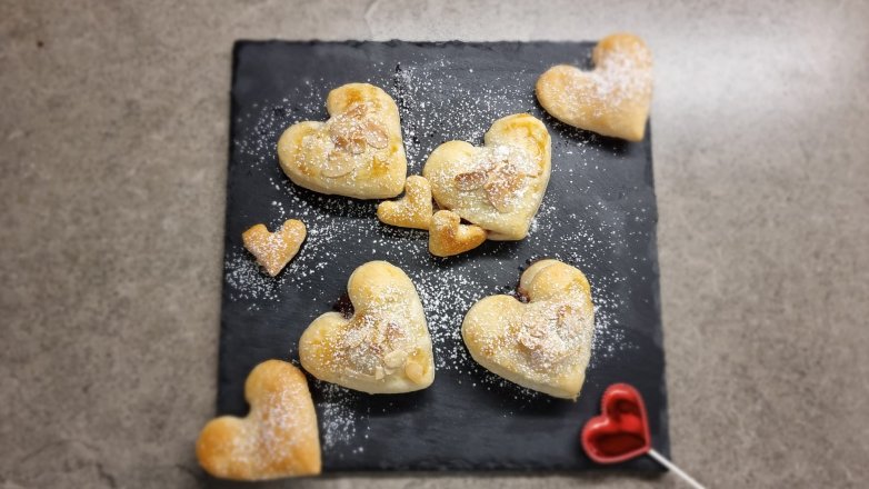 7Disponi i cuori su una teglia con carta forno e cuoci in forno statico preriscaldato a 200°C per circa 20 minuti, o finché saranno dorati e gonfi.8La Ricetta è completata! Lascia intiepidire i cuori di sfoglia ripieni di marmellata e spolverizza con lo zucchero a velo.