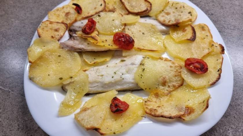 Filetti di branzino con patate al forno: crosta croccante, pesce morbido