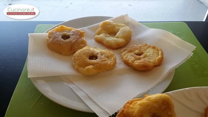 10Passate le fettine di mele nel composto; portate a temperatura l'olio di semi in una padella.11Procedete alla frittura: poche frittelle per volta (per non avere bruschi cali di temperatura dell'olio).12Con carta da cucina eliminate l'unto in eccesso.
