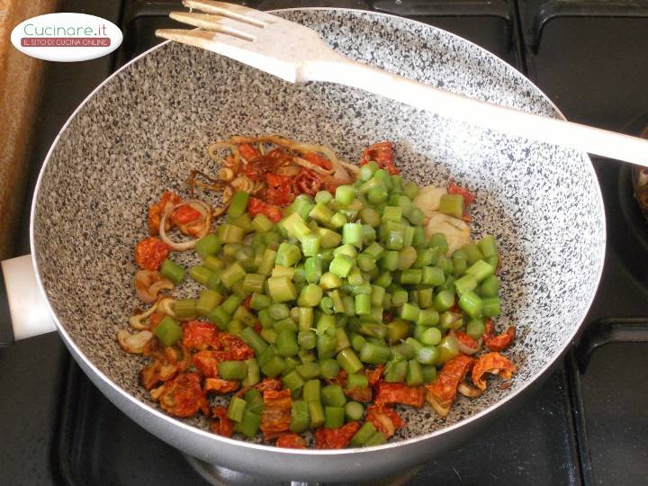 2Lasciatelo appassire dolcemente a fiamma bassa e poi aggiungete i pomodori secchi tagliati a pezzettini.Fate insaporire per qualche minuto a fiamma bassa mescolando spesso e poi unite i gambi degli asparagi tagliati a cilindretti.. 3Mescolate e spolverizzate con sale viola.