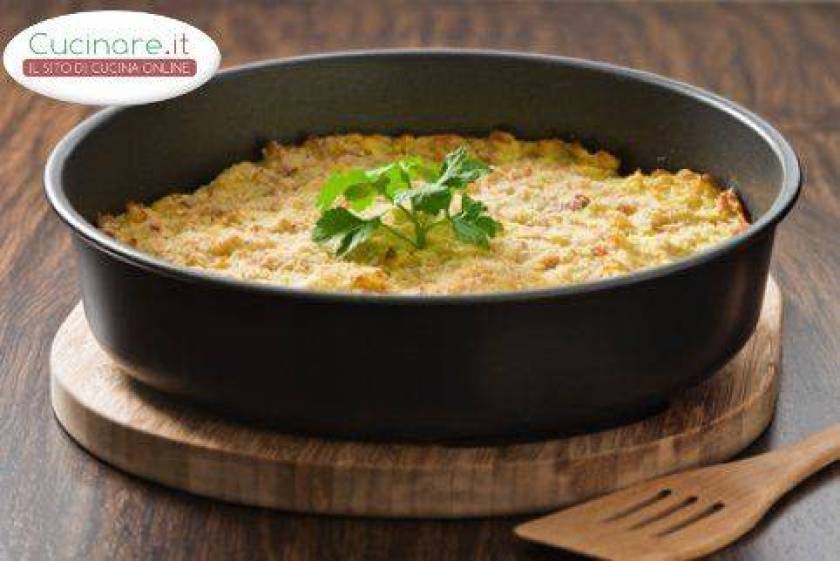 Prendete uno stampo, di quelli che hanno il bordo estraibile, imburratelo e cospargetelo di pane grattugiato. Versate dentro il composto di patate, spolverizzandolo di pane grattugiato. Mettete in forno già caldo e cuocete per 40 minuti a 180 gradi. Servitelo con guarnizione di piselli al burro o carciofi in padella.