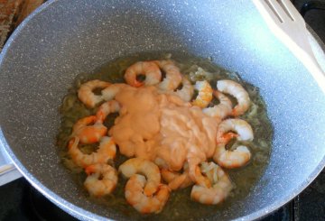 Poi si uniscono i gamberi e si lasciano insaporire massimo per 1 minuto altrimenti diventano dei pezzetti di cartone insipido. Se scegliete gamberi freschi fate attenzione al momento dell'acquisto che non abbiano macchiature scure oppure potete optare per quelli surgelati che potete trovare già sgusciati e senza testa.