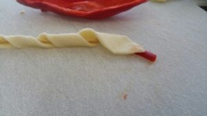 1Aprite la confezione col rotolo di pasta sfoglia e ricavatene delle strisce di circa 2 centimetri di larghezza.2Attorcigliatele delicatamente a degli spiedi per uso alimentare; schiacciate un'estremità.3Con un pezzetto di peperoncino formate la lingua.