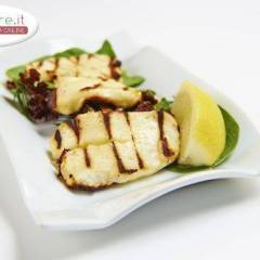 Versate due cucchiai di olio extravergine in maniera omogenea sulla piastra e fate riscaldare per circa 1 minuto. Poggiate le fette di formaggio sulla piastra calda oleata e fatela cuocere per circa 2 minuti per lato. Quando saranno dorati al punto giusto, togliete dal fuoco e servite su un letto di insalata. Potete condire con un filo d'olio a crudo. Buon appetito!.