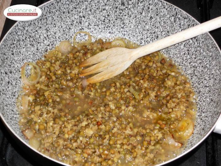 Pelate e tagliate lo scalogno a rondelle. 1Versate in una padella wok 2 cucchiai di olio extravergine di oliva insieme allo scalogno a rondelle e fatelo appassire2Unite i fagioli Mung insieme a 2 mestoli della loro acqua di cottura dopo averli lessati per 20 minuti