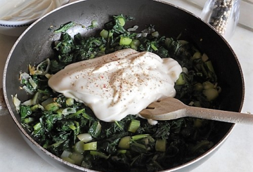 4Aggiungete quasi tutta la besciamella conservandone un paio di cucchiaiate. Spolverizzate con un poco di sale rosa e una bella macinata di pepe misto. 5Mescolate facendo amalgamare bene la besciamella alla cima di rapa. 6Stendete sul fondo di una pirofila la besciamella tenuta da parte.