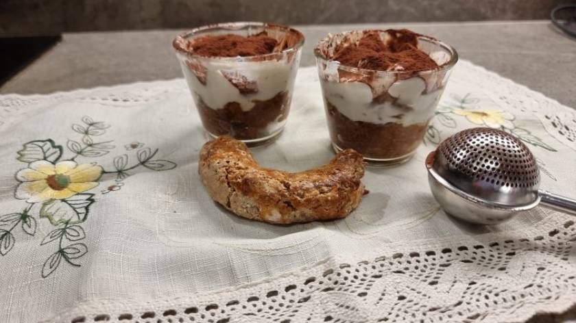 I roccocò, ammorbiditi nel caffè, creano una base profumata di mandorla e spezie che ricorda il tiramisù classico, ma con una nota più fresca e leggera grazie allo yogurt greco intero.