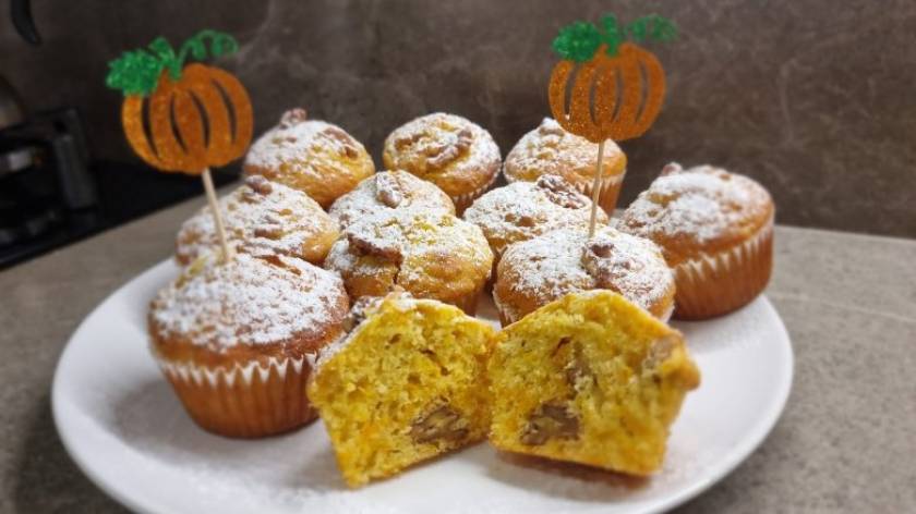 10Cuoci in forno preriscaldato a 170°C ventilato per 25 minuti.11Sforna i muffin alla zucca e lasciali raffreddare.12Disponi questi dolcetti monoporzione alla zucca, cannella, vaniglia e noci in un piatto di servizio.