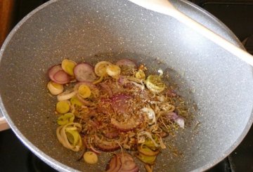 1Pelate la cipolla e lavate il porro. Poi affettateli a rondelle di medio spessore. Metteteli in una padella wok antiaderente insieme all'olio extravergine di oliva.2Lasciate appassire lentamente e leggermente e poi unite il mix di erbe aromatiche.3Mescolate bene e disponete nel wok il coniglio dopo averlo tagliato a piccoli pezzi.