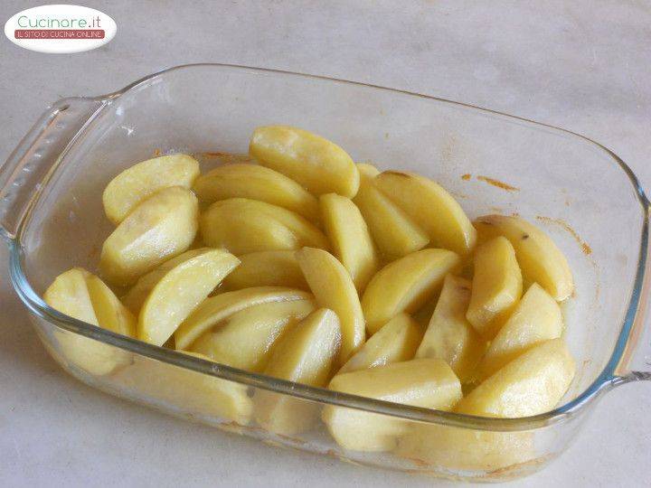 3Versate una tazzina di acqua fredda4Mescolate e condite con un poco di sale blu5Mettete nel forno già caldo a 180 gradi e lasciate cuocere le patate per 30 minuti girandole a metà cottura