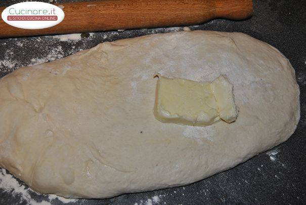 3Trascorso il tempo di lievitazione riprendete il panetto di pasta e dividetelo in due; stendete ciascun panetto con il matterello ed unitevi 12,13 grammi di burro a temperatura ambiente.4Ripiegate i due panetti.5Lasciate che assorbano il burro.