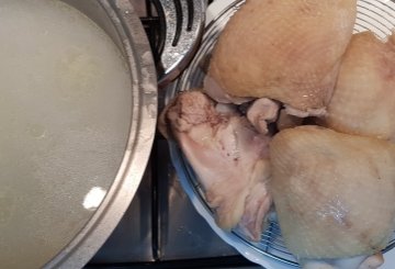 1Per fare il Pollo Ai Peperoni, seguendo la mia ricetta, immergi, senza sciacquare, le sovracosce di pollo in acqua a bollore e falle sgrassare, cuocendole per 10 minuti. Parte del grasso sarà visibile sulla superficie dell'acqua.2Lasciale, poi, scolare bene.3Intanto occupati dei peperoni. Lavali accuratamente, asciugali ed elimina i semi ed i filamenti (anche le parti bianche eventualmente attaccate internamente ai peperoni). Tagliali a falde larghe massimo 1 centimetro (altrimenti resteranno crude), nel senso della lunghezza. Tampona con un canovaccio pulito. Se vuoi, dai uno sguardo alla guida per pulire e tagliare i peperoni presto e bene.