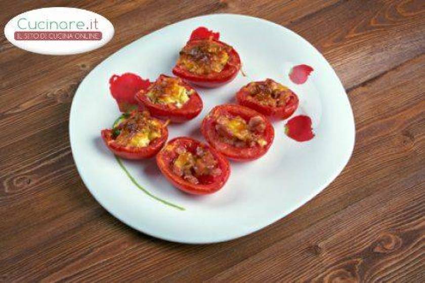 Ungete una teglia da forno con l'olio e posizionate i pomodori su di essa. Infornate in forno già caldo per 40 minuti a 200 gradi. I pomodori gratinati saranno pronti allorquando appariranno raggrinziti e la farcitura sarà, appunto, gratinata .