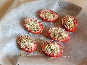 7Trascorso il tempo, disponete i pomodori tagliati a metà sopra una teglia foderata con carta da forno.8Riempiteli con il composto preparato.9Spolverizzateli abbondantemente con il pangrattato.