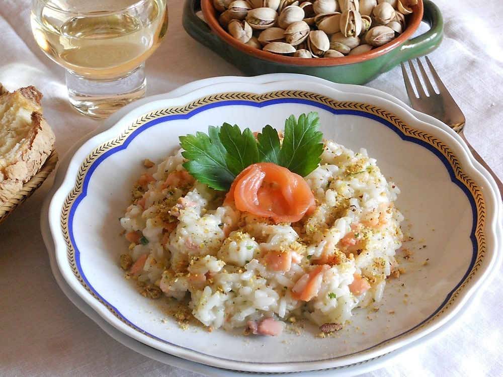 Per realizzare il risotto al salmone affumicato si prepara il risotto come al solito sfumando il vino bianco e aggiungendo poi brodo vegetale o, se preferite e l'avete a disposizione, del brodo di pesce. A cottura ultimata si unisce il salmone affumicato a pezzetti, il burro e il prezzemolo tritato... Il piatto a questo punto è pronto per essere assaporato ben caldo. Consiglio di utilizzare un buon vino bianco fruttato come un Vermentino di Sardegna che poi servirete anche in tavola per accompagnare il piatto. In alternativa al vino potete sfumare il riso anche con Vodka oppure Cognac. In sostituzione del prezzemolo, è possibile anche usare dell'aneto fresco tritato oppure essiccato. Darà una nota ancora più fragrante e particolare al vostro risotto con salmone affumicato. Per condire ho usato il sale affumicato che trovo molto più indicato da abbinare al resto degli ingredienti in quanto dona un sapore più intenso e aromatico. Per arricchire la ricetta del risotto al salmone ho usato della granella di pistacchi spolverizzata sul piatto prima di servirlo in tavola. La sua consistenza croccante crea un contrasto molto gradevole con la morbidezza e la sofficità del salmone e del riso oltre che aggiungere un tocco di sapore e di colore molto piacevole. In sostituzione dei pistacchi, si può optare per la granella di noci, semi di sesamo o di papavero. Servite il vostro il risotto con salmone affumicato e pistacchi ben caldo e buon appetito!Ingredienti
