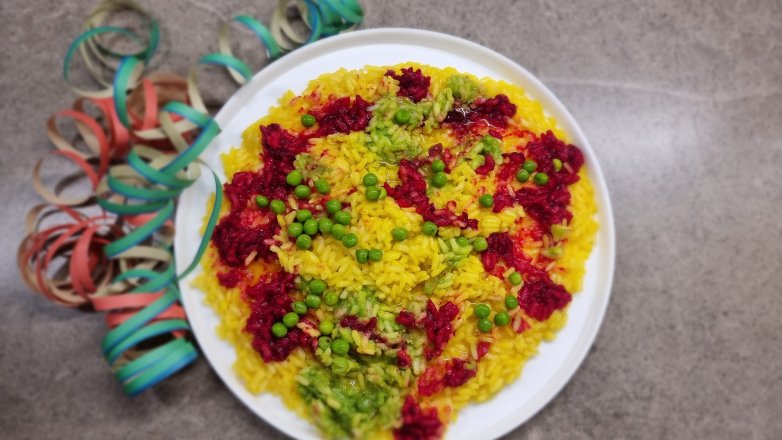 1Parti dal Risotto - In una casseruola: olio + cipolla tritata con un pizzico di sale, 2 minuti dolci (tieni il brodo sempre caldo in una pentola a parte). Aggiungi il riso e tostalo 1 minuto.2Inizia a cuocere aggiungendo brodo poco alla volta, mescolando ogni tanto, per 15–18 minuti (dipende dal riso).3Mentre il risotto cuoce, prepara i “colori”- Verde (piselli)- Metti i piselli surgelati in acqua bollente o brodo: 5–7 minuti.