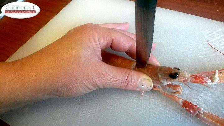 Si parte da un buon lavaggio sotto acqua corrente, poi si asciugano. Si dispongono su un piano da lavoro e s'incidono dalla testa alla la coda per togliere il filo nero. E importante non dividere il corpo in 2 parti perchè bisogna solo aprirli. A questo punto sei pronto per procedere con la preparazione. Ti lascio alla fotoricetta completa. Buona lettura.Ti consiglio anche la ricetta degli scampi in padella, delle linguine agli scampi e delle capesante gratinate.