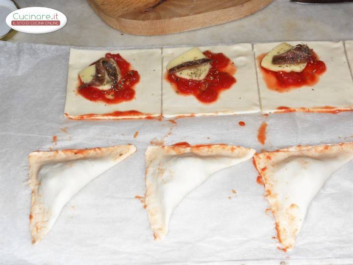 4Completate con 1 filetto di acciuga ben sgocciolato dall'olio e una spolverata di origano5Ripiegate la pasta sfoglia a triangolo sopra il ripieno e richiudete bene i lembi premendo con le ditaFoderate una teglia con carta da forno e adagiatevi le sfogliatelle.