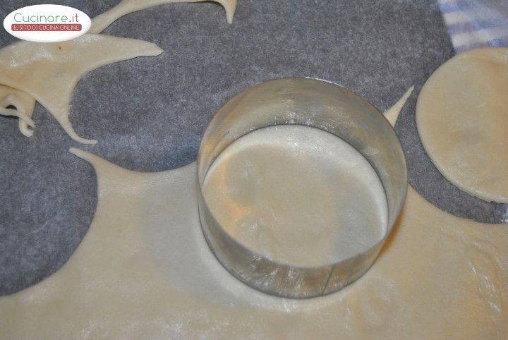 4Su un piano da lavoro stendete la pasta frolla e con l'aiuto di un coppa pasta formate una quindicina di pettoline.5Al centro di ognuna ponete parte del ripieno.6Coprite con un altro dischetto di pasta frolla, premendo bene sui bordi.