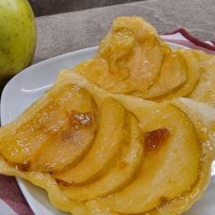 7Falle intiepidire e poi posizionale capovolte in un piatto (puoi utilizzare una spatola o una forchetta, per fare leva), col ripieno di mele goloso a vista!8Le sfoglie di mele sono pronte! Sono squisite e ideali anche anche a fine pasto!