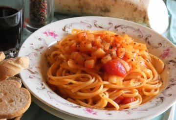 Per realizzare il sugo utilizzate pomodorini marzanini in scatola: sono dei piccoli pomodori San Marzano, polposi e sodi immersi in un succo corposo, ideali per formare un sugo denso e vellutato che avvolge perfettamente la pasta. Se non li trovate potete optare per i pomodorini di collina: sono ciliegini sempre in scatola con un succo anch'esso corposo. Altrimenti consiglio di utilizzare della passata di pomodoro.