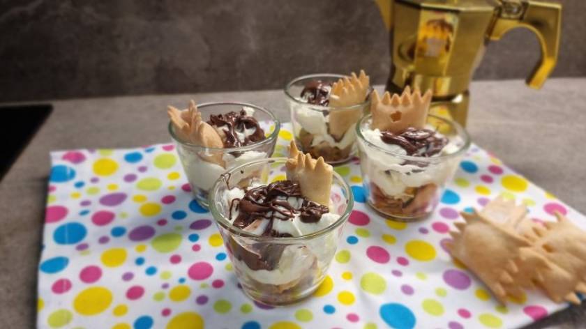 1Distribuisci le chiacchiere spezzettate sul fondo dei bicchieri.2Bagna ogni porzione con 1 cucchiaio di caffè amaro a temperatura ambiente. 3Prepara la crema al mascarpone a freddo: in una ciotola pulita monta 100 ml di panna fresca non zuccherata con le fruste