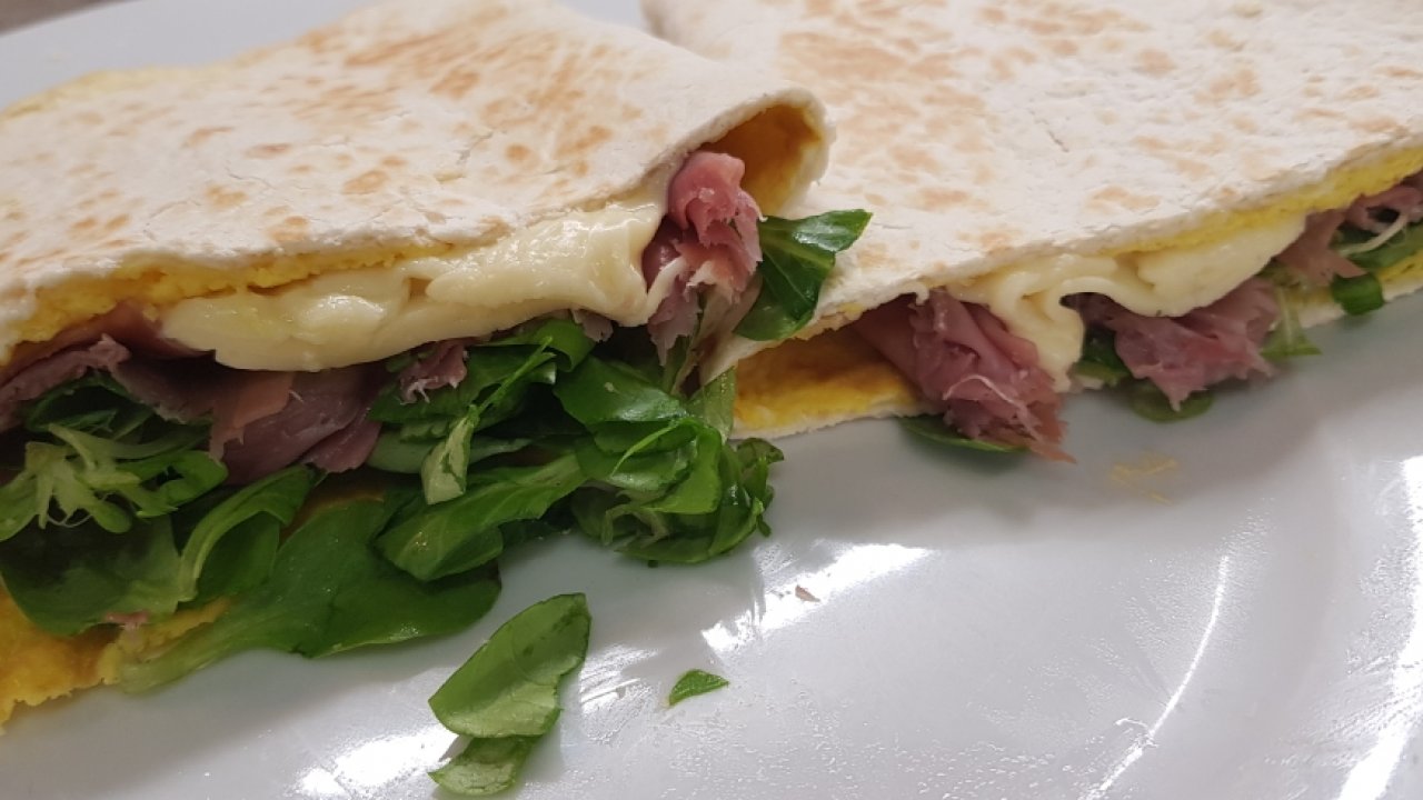 La ricetta è facilissima, sfiziosa e golosa. In sintesi ho italianizzato un alimento della cucina estera. Per questa preparazione, ho utilizzato 1 uovo per ogni tortilla. Quindi ho preparato una semplice frittata condita con 1 cucchiaio raso di parmigiano grattugiato e l'ho cotta in una padella con un filo d'olio. Quando la frittata stava per rapprendersi, l'ho coperta con una tortilla: i due alimenti si sono uniformati perfettamente. A quel punto ho arricchito la preparazione con prosciutto crudo ed emmenthal poi ho chiuso la tortilla ed ho continuato la cottura fino a far fondere il formaggio. Ho concluso con una buona manciata di insalata. Una bontà! Inutile dirti che la base di tortilla con frittata in padella può essere farcita secondo il proprio gusto, quindi con i salumi e i formaggi che preferisci.