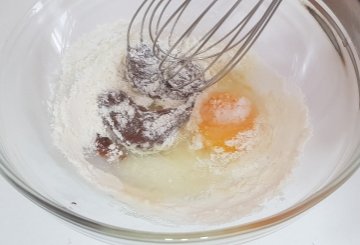 1Sgusciamo un uovo medio in una ciotola ed aggiungiamo un pizzico di sale fino e mezzo cucchiaio di zucchero.2Versiamo anche 1 cucchiaio di farina 00 (non occorre setacciarla),3ed 1 cucchiaio di nutella.