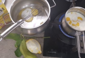 10Intanto occupiamoci della crema pasticcera. Scaldiamo 250 ml. di latte intero, + la scorza di mezzo limone non trattato, fino a sfiorare il bollore; in un'altra pentola lavoriamo 2 tuorli d'uovo con 1 cucchiaio e mezzo di zucchero e poi aggiungiamo 2 cucchiaio di maizena (o anche farina 00)11Togliamo le bucce di limone, versiamo il latte sul composto di uova, zucchero e farina e facciamolo addensare, a fiamma bassissima, girando con una frusta a mano.12Versiamo la crema in una ciotola, copriamo con pellicola a contatto, e facciamola raffreddare.